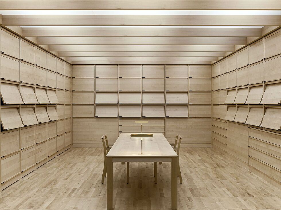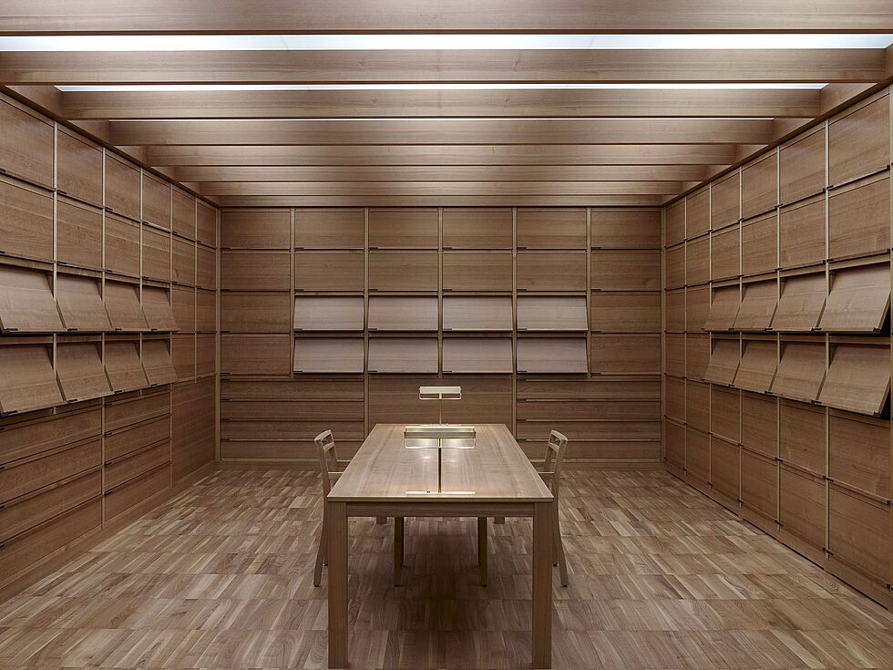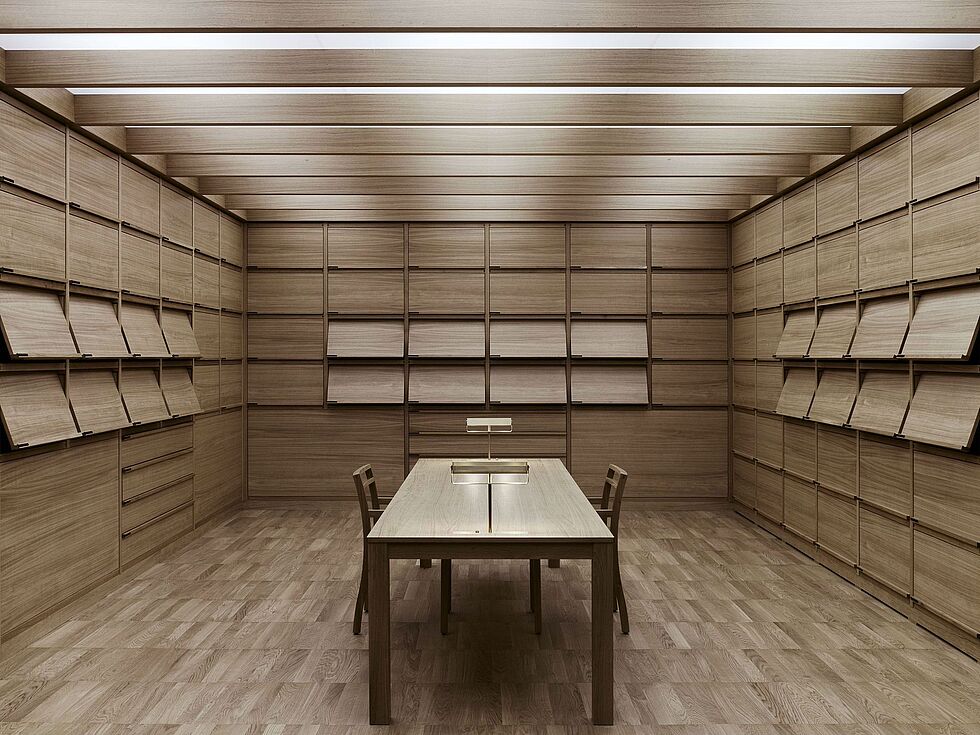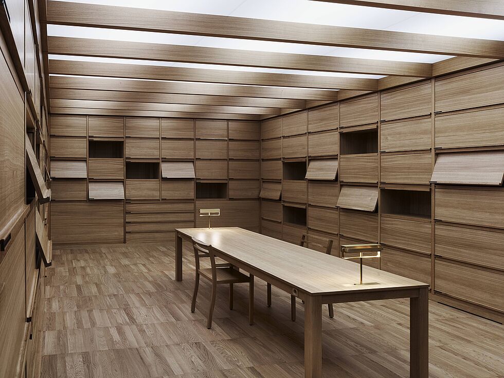 Je einem Künstler zugeordnet, formiert sich ein zentral gesetztes Geviert, das sich zum rundumlaufenden Erschließungsgang hin als schwarzer Quader zeigt. Die vier Arbeitssäle, im Aufbau exakt gleich gehalten, unterscheiden sich einzig in der Materialität des Holzes, in dem Boden, Wand, Deckenträger und Möblierung ausgeführt sind: Birke – Eiche – Kirsche – Nuss bestimmen durch Struktur und Farbgebung die jeweilige Atmosphäre. Die Einrichtung der durch Oberlichte beleuchteten Studierzimmer ist von schlichter Eleganz: ein Tisch, zwei Messingleuchten, die umlaufende Regalwand.