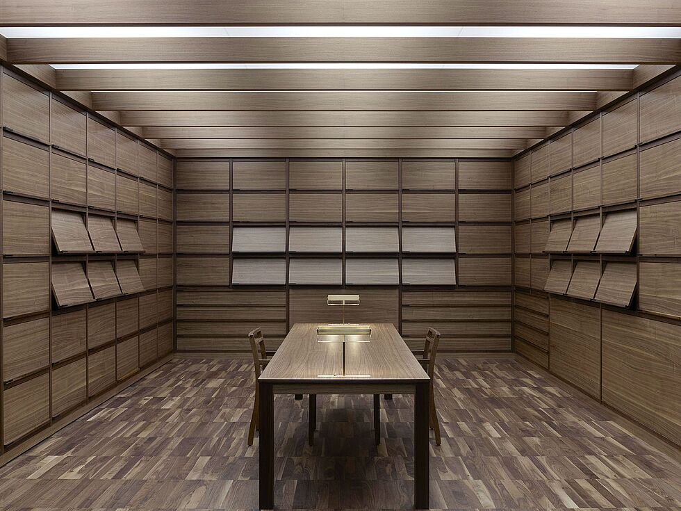 Je einem Künstler zugeordnet, formiert sich ein zentral gesetztes Geviert, das sich zum rundumlaufenden Erschließungsgang hin als schwarzer Quader zeigt. Die vier Arbeitssäle, im Aufbau exakt gleich gehalten, unterscheiden sich einzig in der Materialität des Holzes, in dem Boden, Wand, Deckenträger und Möblierung ausgeführt sind: Birke – Eiche – Kirsche – Nuss bestimmen durch Struktur und Farbgebung die jeweilige Atmosphäre. Die Einrichtung der durch Oberlichte beleuchteten Studierzimmer ist von schlichter Eleganz: ein Tisch, zwei Messingleuchten, die umlaufende Regalwand.